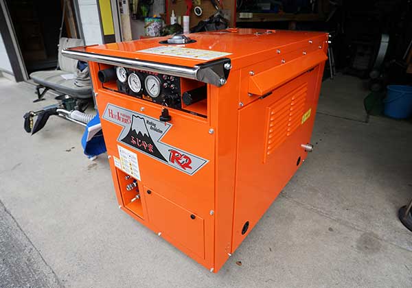 3工程一体型マシン(温水+高圧洗浄+汚水回収)の 『ふじやまR2』を導入。高出力エンジンと150m吸引ホースの機動力で活躍しています。