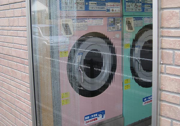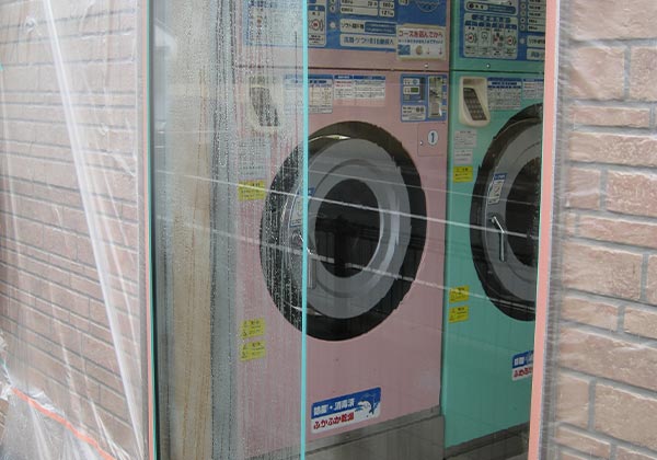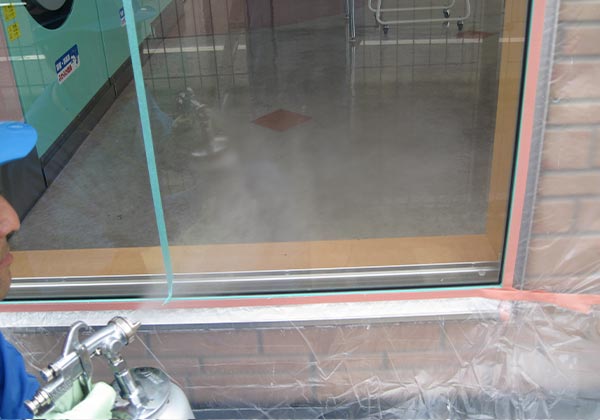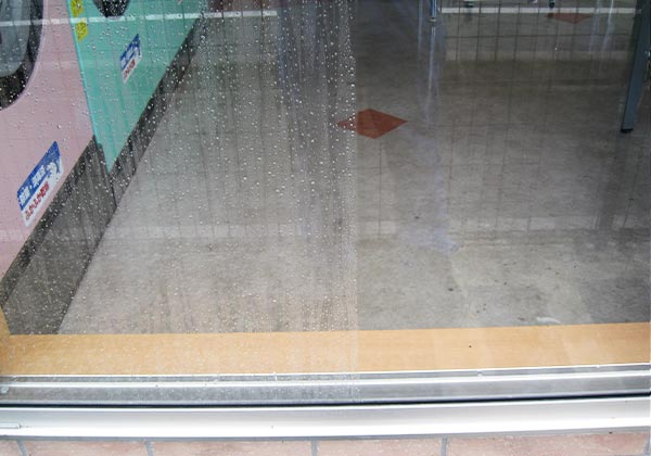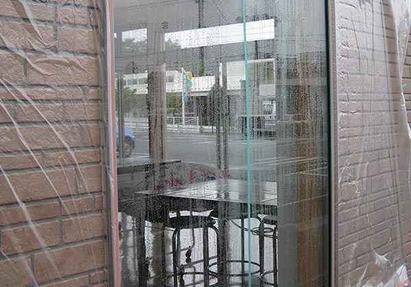 その真逆の現象が「親水」効果です。 油の浮いた食器に洗剤を1滴垂らすと油膜がさっと広がり 消えていくCMがありますが、これは、表面張力が無くなる現象です。光触媒ガラスコートは表面張力を無くすこの「親水」の原理を利用しています。光触媒を吹付けると、太陽光(紫外線)※が汚れを分解し、汚れが浮いた状態になります。さらにここに雨や水がかかると、水滴が粒状にならないのでジワ―っと広がり流れ落ち、汚れも一緒に流れていきます。 雨が降る度にガラスがきれいになっていくので、セルフクリーニングと呼ばれています。雨に濡れても粒状にならないため視界が良好です。カフェや美容院など店舗の美観もUPする効果もあります。