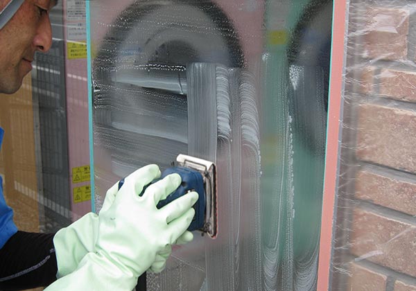 (3)特殊な研磨剤とサンダ―を使用してガラス表面の付着物や目に見えない膜を除去します。